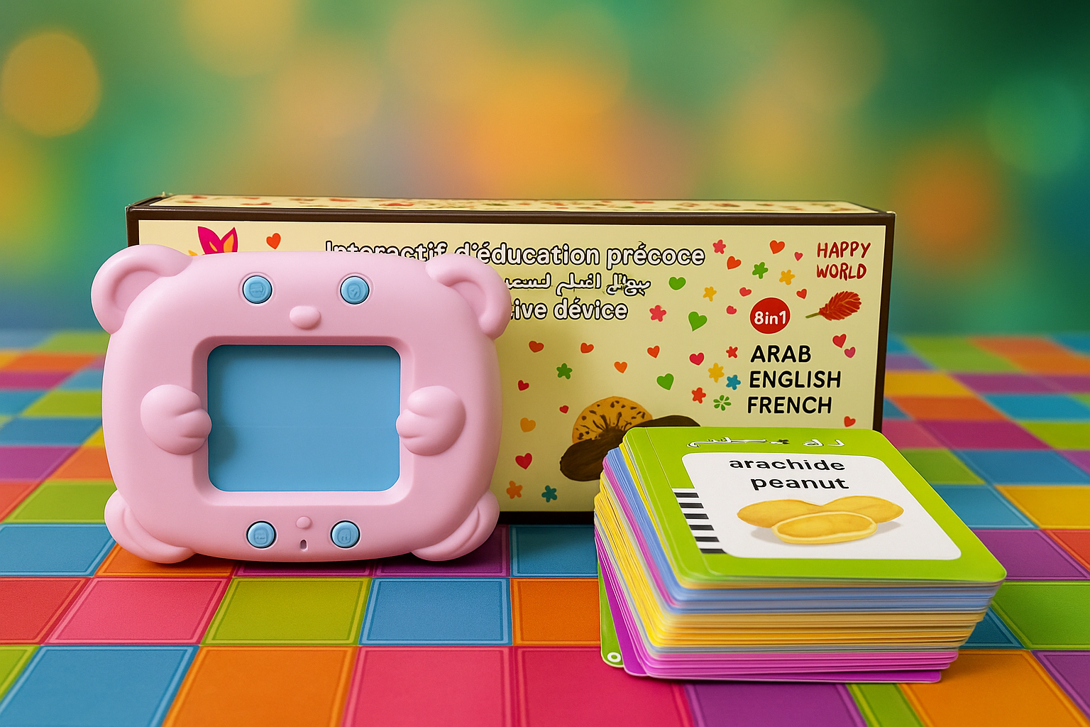 يعلم الطفل بثلاث لغات: العربية، الفرنسية و الانجليزية. يعاونهم يتعلمو الكلمات بسهولة وبطريقة ممتعة.
